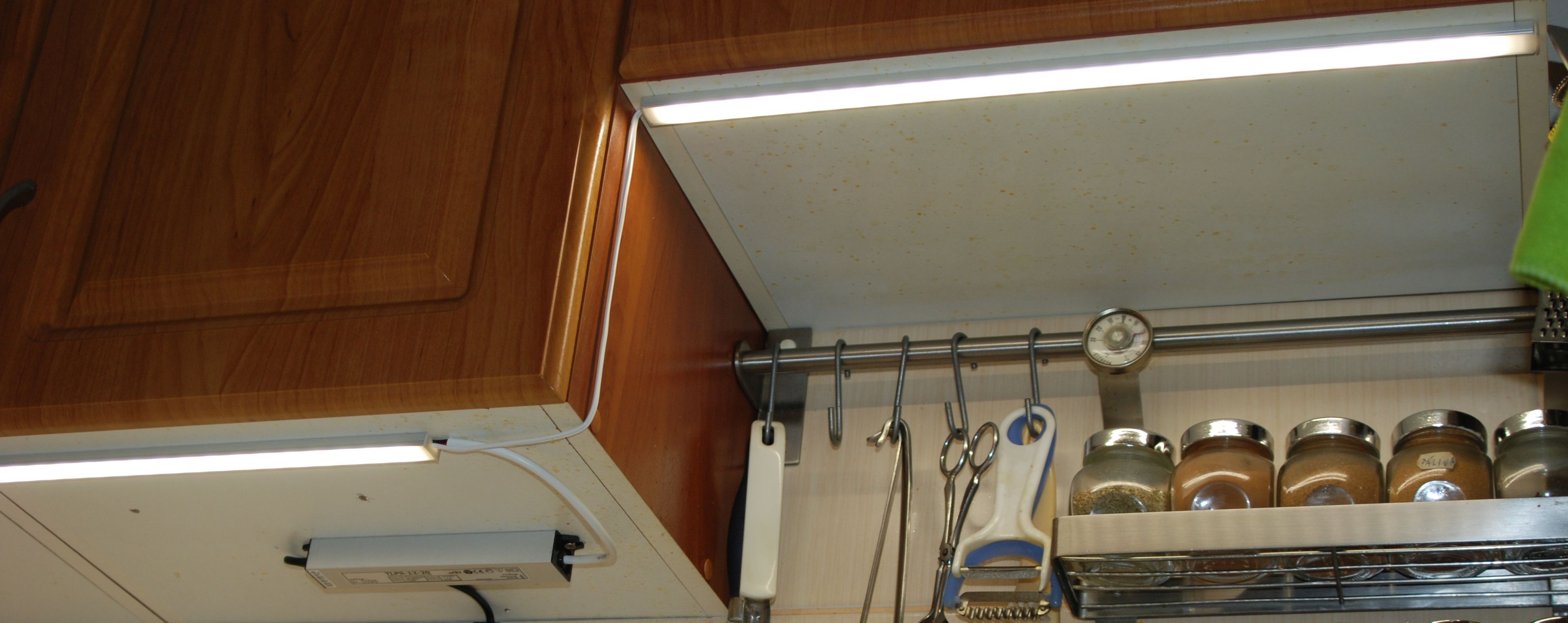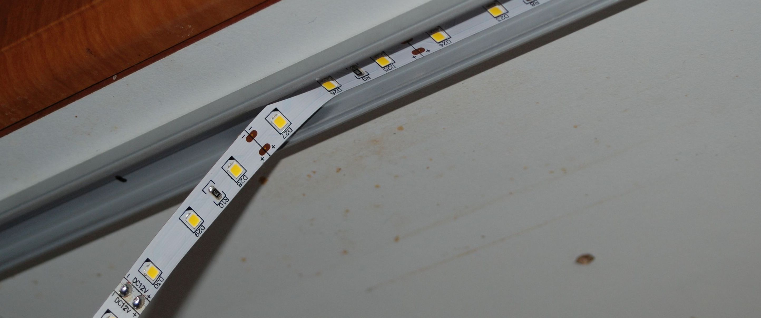 Nejčastěji se pásky upevňují do lišty pod policemi nad kuchyňskou linkou. Ideální výkon pásku je 12W na jeden metr. Pásek bude v profilu s difuzorem, proto pásek nemusí mít krytí a nemusí být zalitý v silikonu. Ideální je tedy tento pásek s bílým světlem: led pásek bez krytí