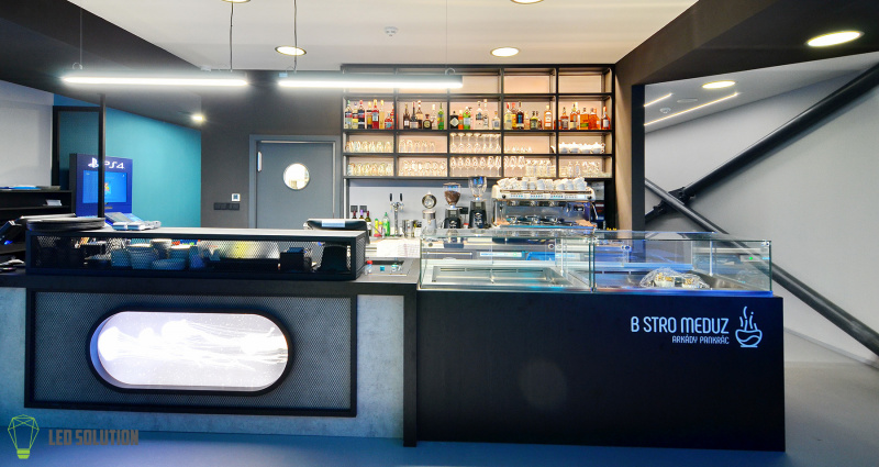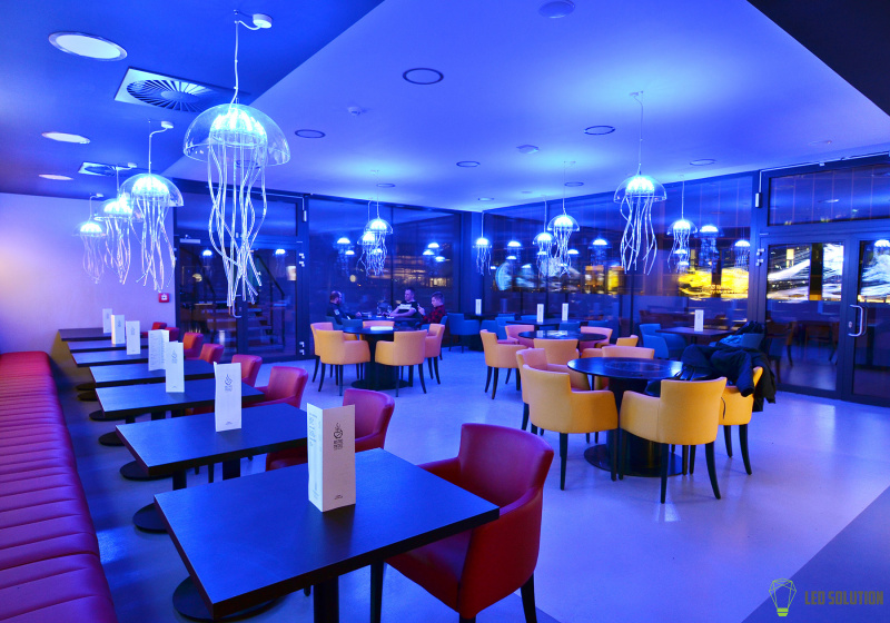 Osvětlili jsme celý Svět medúz včetně bistra, pro které jsme dodali zakázkově vyrobené lustry. Všechna světla zde lze stmívat a vytvořit tak požadovanou atmosféru. Svět medúz je unikátním projektem na střeše obchodního domu Arkády Pankrác.