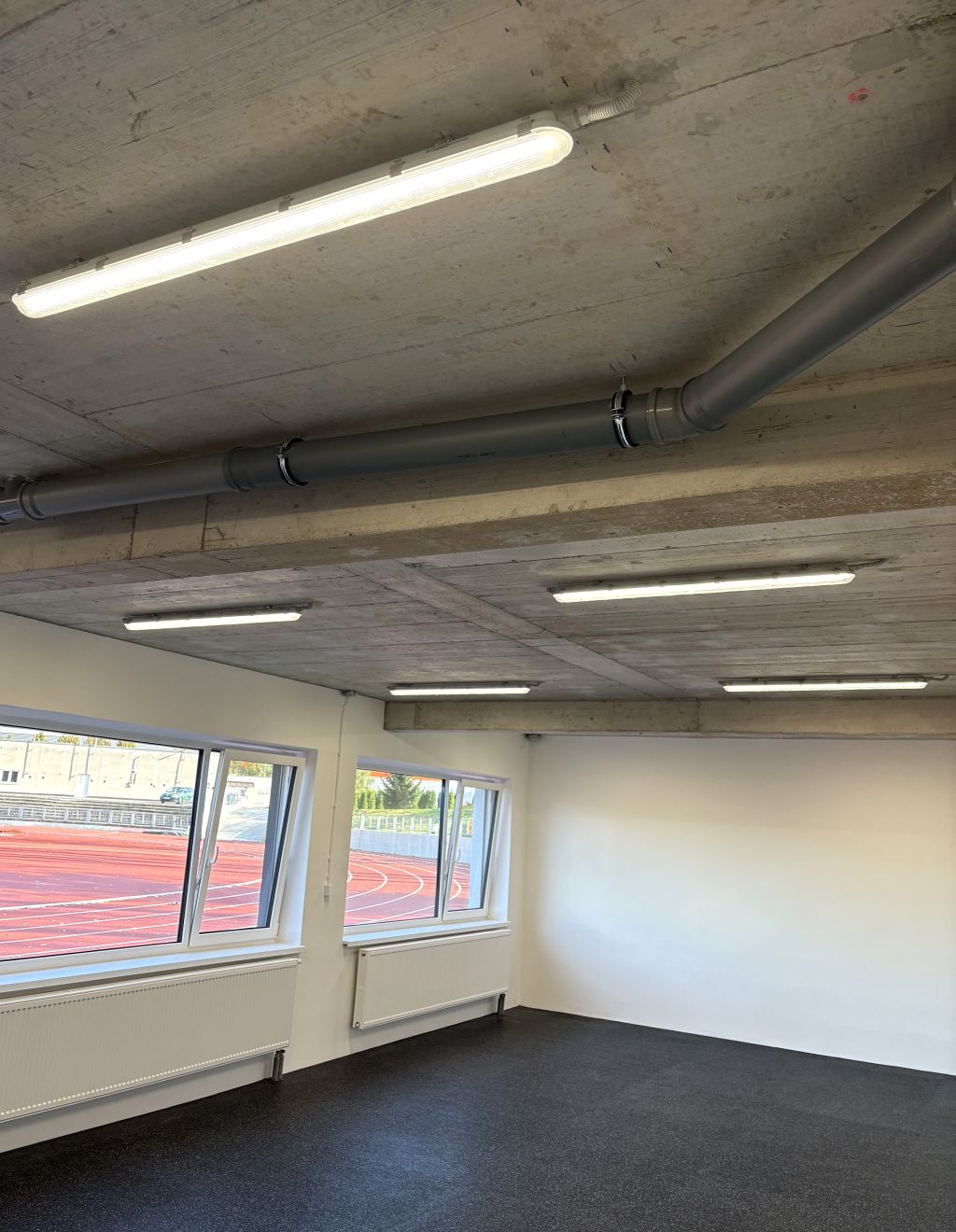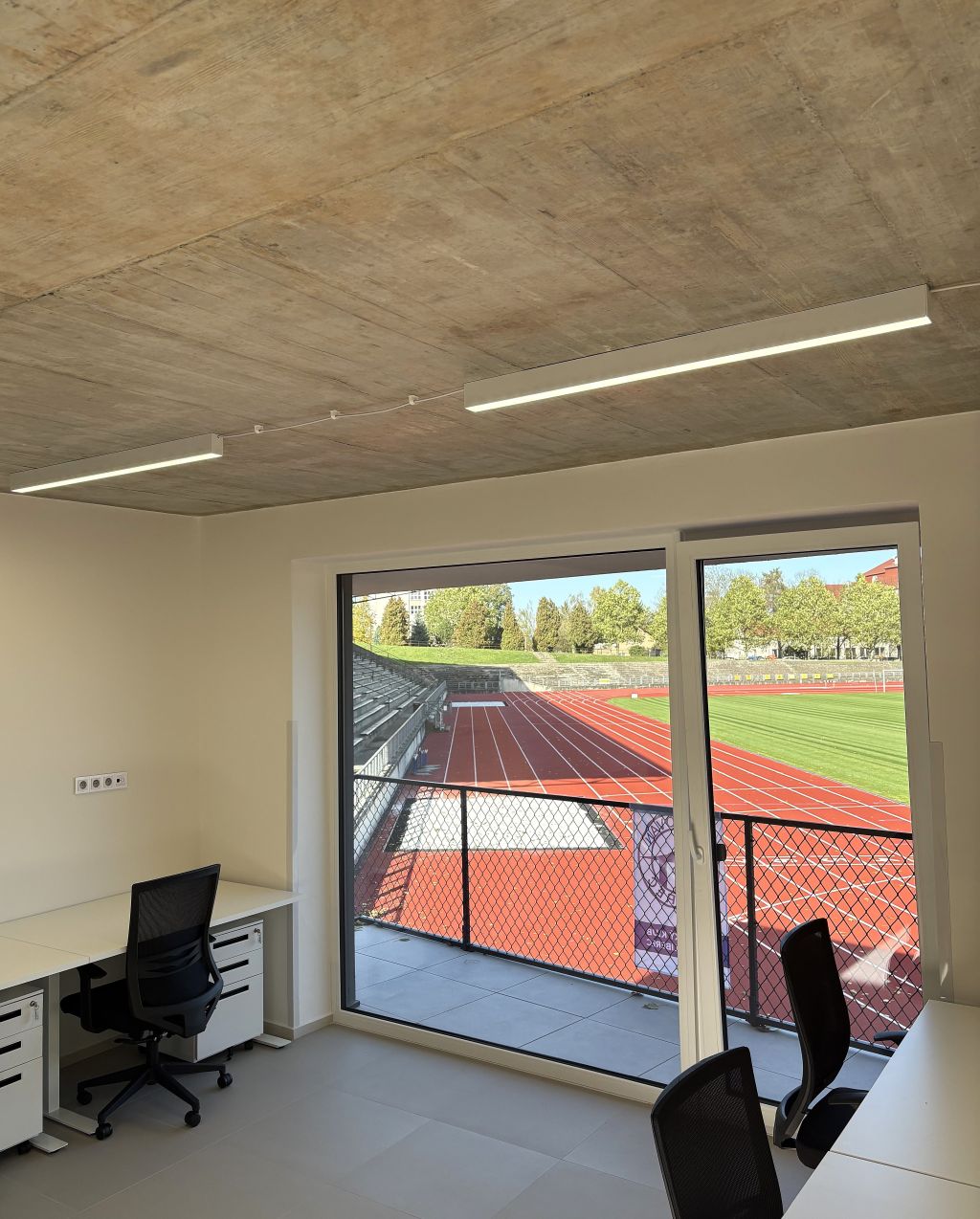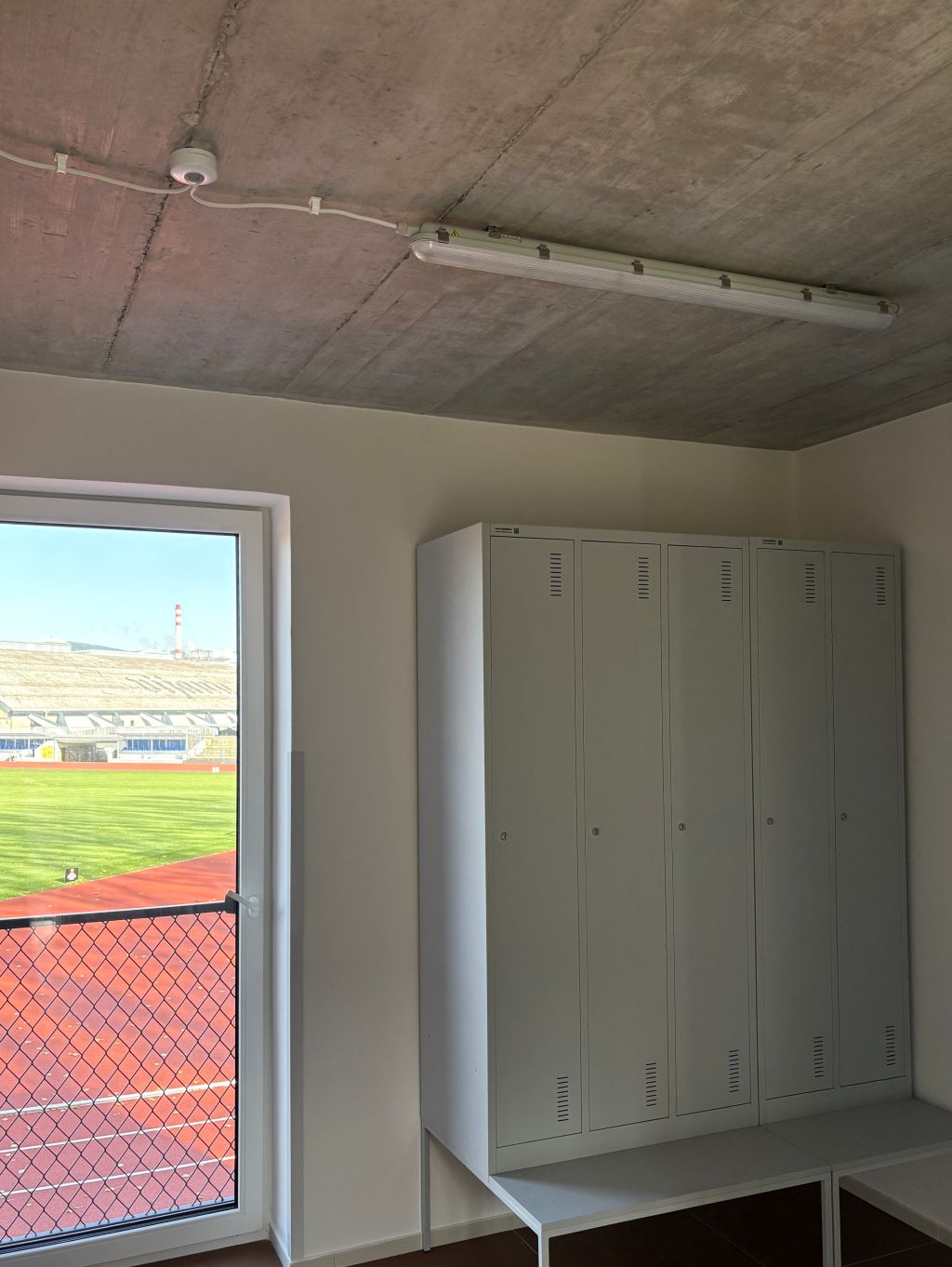 Na atletickém stadionu v Liberci jsme se postarali o kompletní osvětlení nového zázemí. Protože sportovci musí vidět nejen na trať, ale i do tašky v šatně, realizovali jsme moderní LED osvětlení všech prostor – od šaten, sprch a posilovny až po venkovní osvětlení budovy.