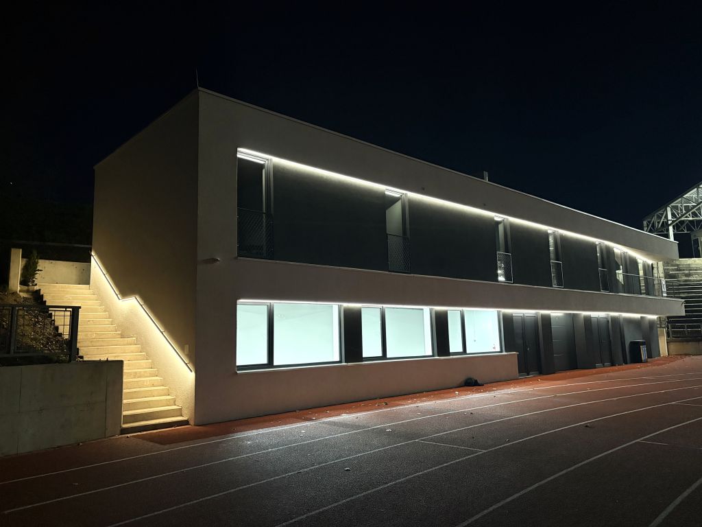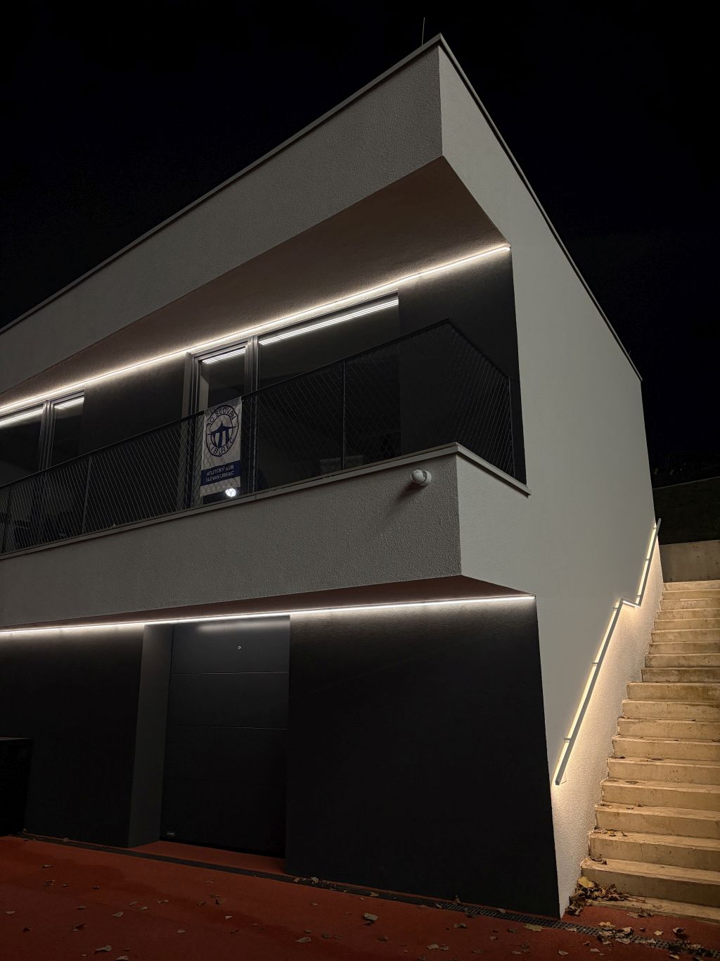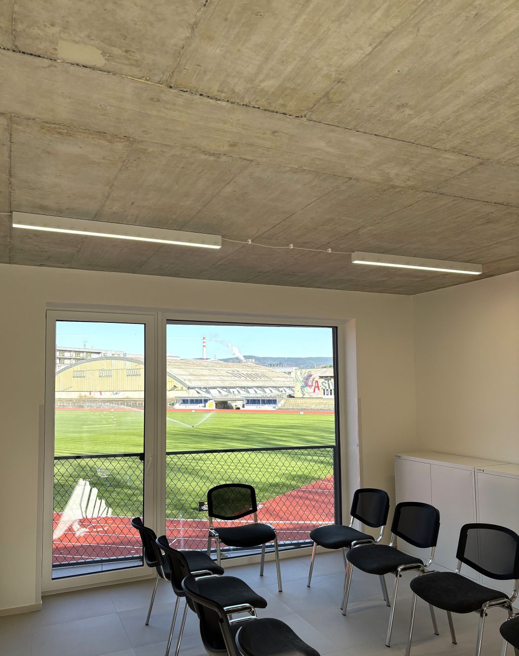 Použili jsme kombinaci úsporných LED panelů a průmyslových svítidel, které zvládnou každodenní tréninkový nápor i vysokou vlhkost v zázemí. Na venkovní osvětlení budovy jsme použili LED pásky s vysokým stupněm krytí a večer díky nim stadion září moderním a stylovým dojmem.