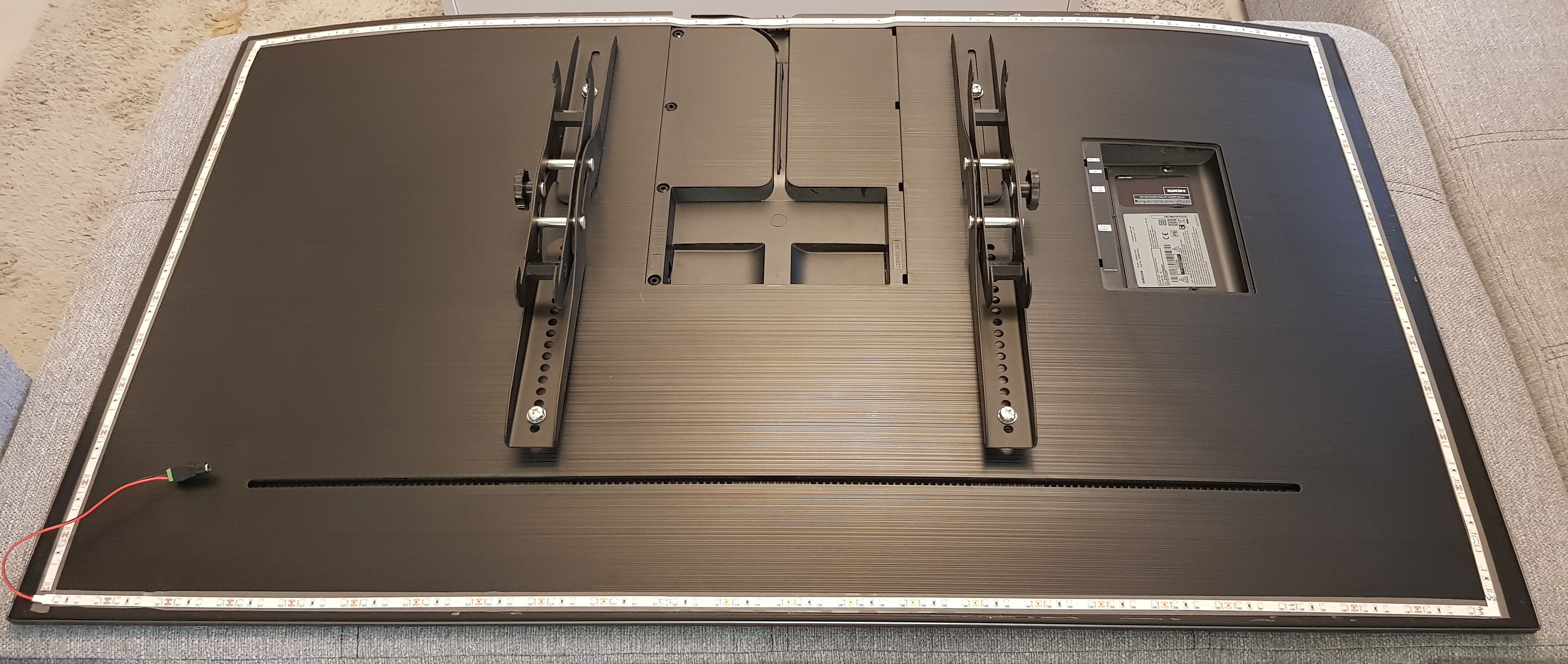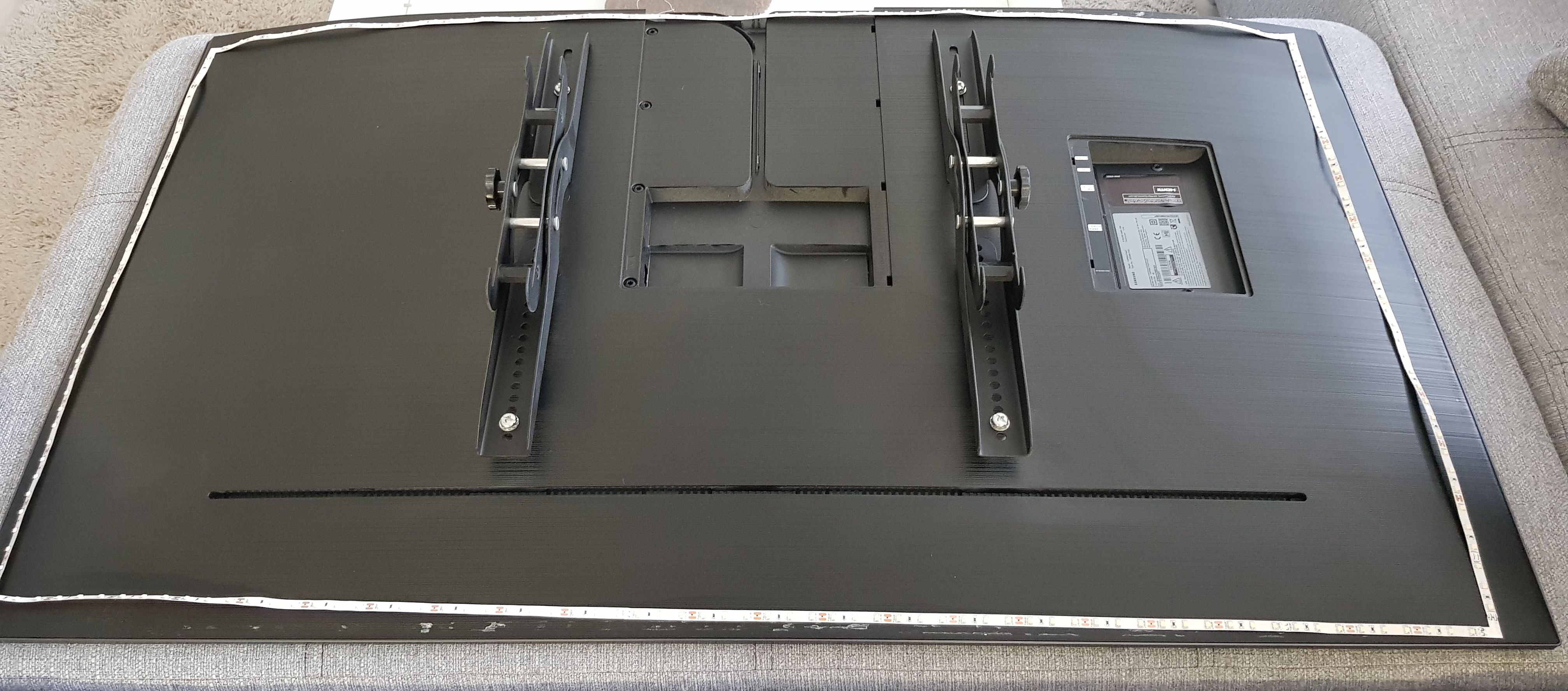 Das Ergebnis sollte ein zu einem Rechteck verbundener Streifen sein, der an den Fernseher angeschlossen werden kann. Vor der endgültigen Installation empfiehlt es sich, den Streifen auf der Rückseite des Fernsehers zu positionieren und die genaue Platzierung zu markieren.