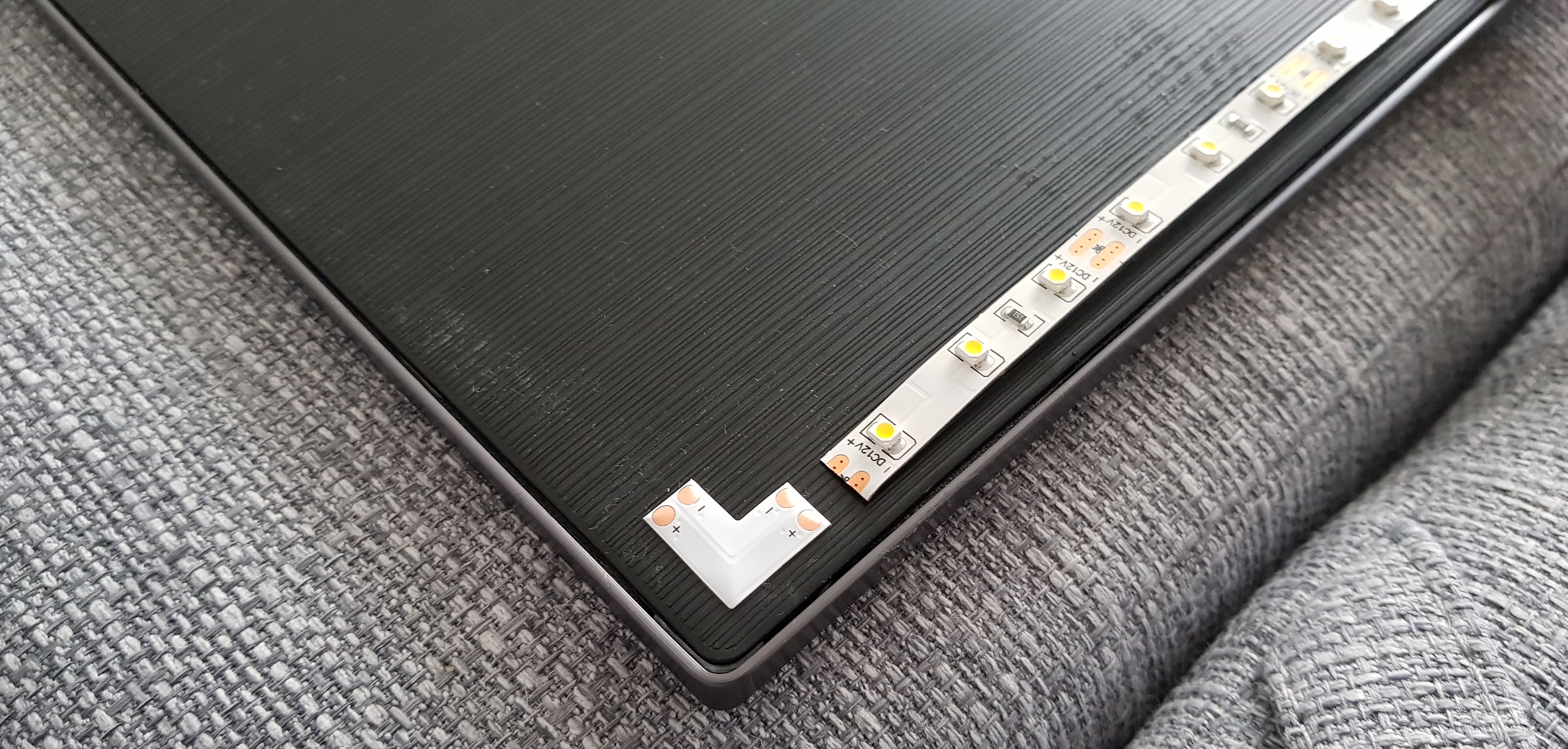 In diesem Stadium sollte der LED-Streifen bereits vermessen und zugeschnitten sein, sodass Sie ihn nun zu der gewünschten rechteckigen Form verbinden können. Die Ecken können auf verschiedene Arten verbunden werden.