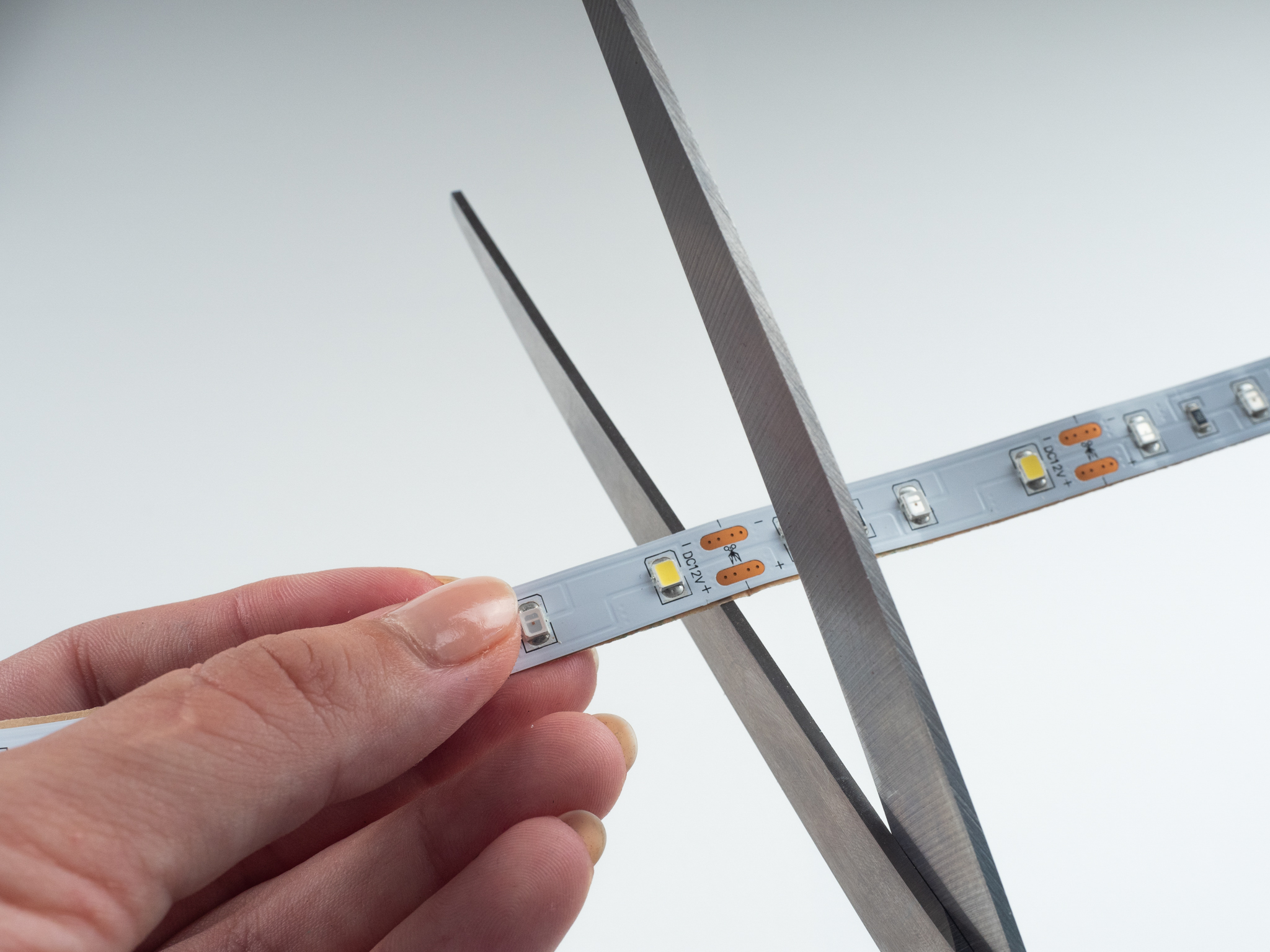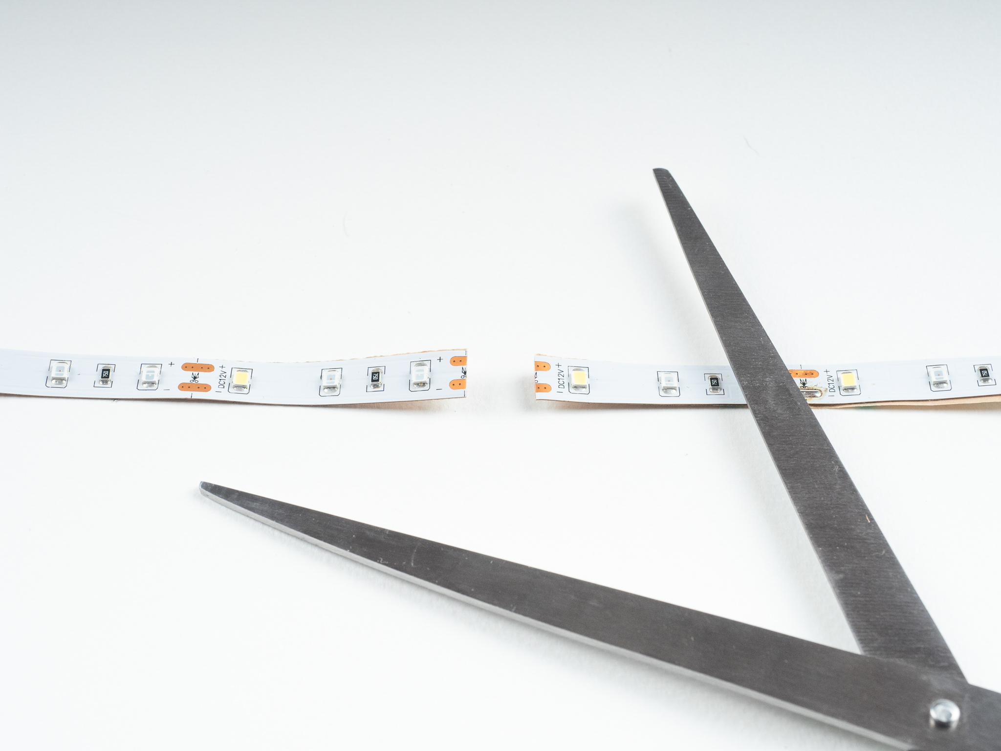 LED-Streifen lassen sich relativ einfach auf die gewünschte Länge zuschneiden. Dazu benötigen Sie lediglich eine saubere, scharfe Schere oder eine Schneidezange. Je nach Typ lassen sich LED-Streifen in bestimmte Segmente unterteilen, die durch Kupferlötpads gekennzeichnet sind. Der LED-Streifen kann in der Mitte dieser Pads durchtrennt werden. In den meisten Fällen befindet sich an dieser Stelle eine quer verlaufende schwarze Linie auf dem Streifen, oft begleitet von einem Scherensymbol.