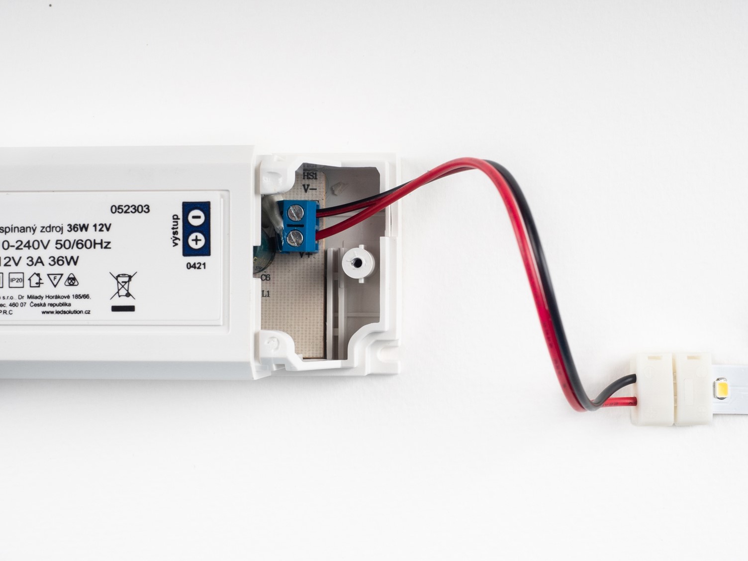 Die Spannungsumwandlung erfolgt über ein Netzteil (früher als Transformator bezeichnet). Sie wandelt die 230-V-Netzspannung in die vom LED-Streifen benötigte Betriebsspannung um, d. h. 12 V oder 24 V. Die richtige Spannung muss über alle Komponenten hinweg aufrechterhalten werden, d. h. die Ausgangsspannung des Netzteils muss mit der von Ihrem LED-Streifen benötigten Spannung übereinstimmen. Wenn der LED-Streifen für 12 V ausgelegt ist, muss das Netzteil genau 12 V liefern.
