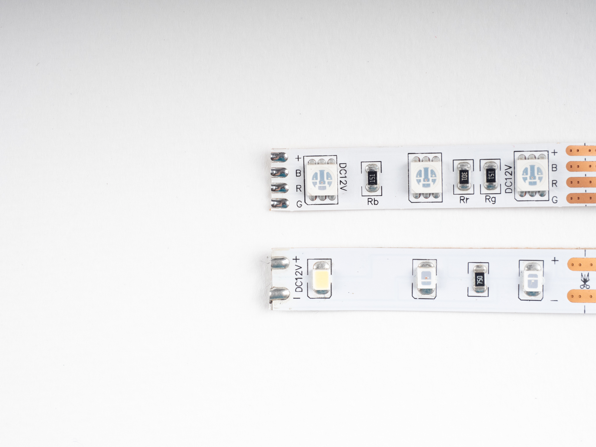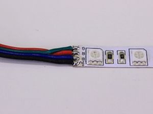 | Gelötete Drähte auf einem einfarbigen Streifen. | Gelötete Drähte auf einem RGB-Farbstreifen. |