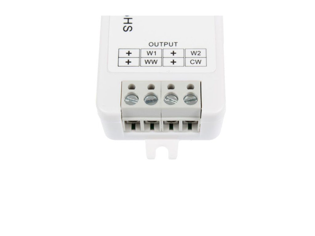 Funkempfänger dient zur drahtlosen Steuerung von CCT LED-Streifen mit einstellbarer Farbtemperatur und auch von einfarbigen LED-Streifen. Dank zweier Ausgänge können sowohl die Intensität als auch die Farbtemperatur des Lichts je nach Bedarf einfach geregelt werden.
