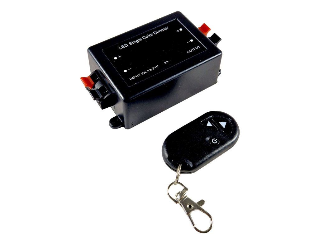 Einkanal-Dimmer zur Steuerung der Helligkeit von LED-Streifen oder 12V-Lampen. Der Dimmer speichert die letzte Einstellung vor dem Trennen der Stromversorgung. Der Empfänger kann versteckt werden und muss zur Steuerung nicht sichtbar sein.