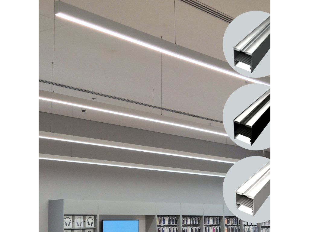 Das Profil ist ideal für die Schaffung einer eleganten Hängebeleuchtung mit 1,5 Meter langen Abhängesets. Diese Sets sind in drei Farbvarianten erhältlich – Silber, Schwarz und Weiß –, was ihre Abstimmung auf das Innendesign erleichtert. Durch das Aufhängen des Profils mit diesen Sets erzielen Sie eine moderne lineare Leuchte mit „schwebendem“ Effekt, die ideal für Büros, Ausstellungsräume, Küchen und Wohnzimmer ist. Diese Montageart ermöglicht eine flexible Höhenverstellung und sorgt für ein sauberes und professionelles Erscheinungsbild der Beleuchtung.