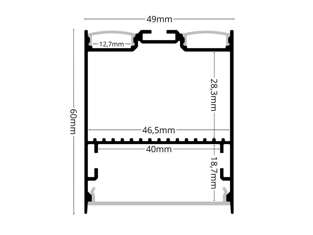 Der untere Teil bietet Platz für 1 bis zu 3 LED-Streifen nebeneinander, was eine hohe Lichtleistung nach unten gewährleistet. Die oberen beiden separaten Kanäle sind für weitere LED-Streifen vorgesehen, die eine sanfte, indirekte Deckenbeleuchtung erzeugen.