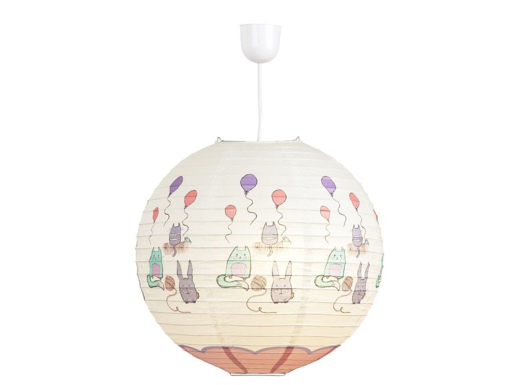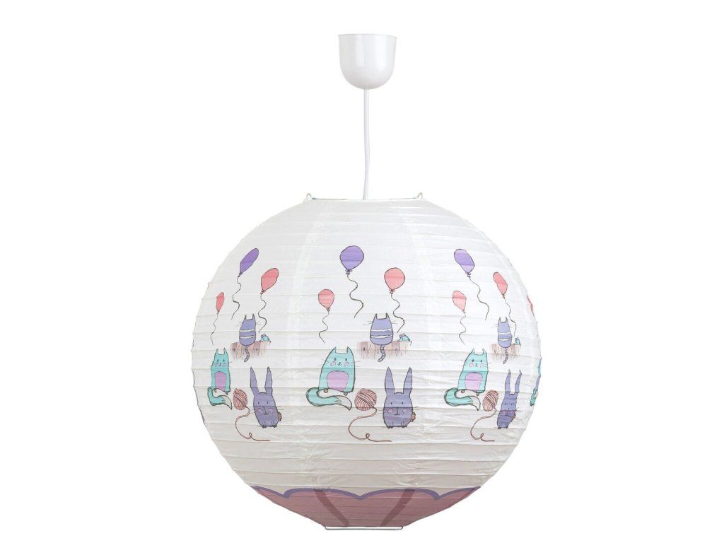 Der Kinder-Papier-Lampenschirm Cathy ist eine niedliche Ergänzung, die ein verspieltes Motiv in das Kinderzimmer bringt. Das Design des Lampenschirms ziert ein niedliches Kätzchen, ein Kaninchen und ein Wollknäuel, ergänzt durch Ballons in der Luft. Dieses Motiv bringt Verspieltheit und eine fröhliche Atmosphäre, die jedes Kind ansprechen wird.