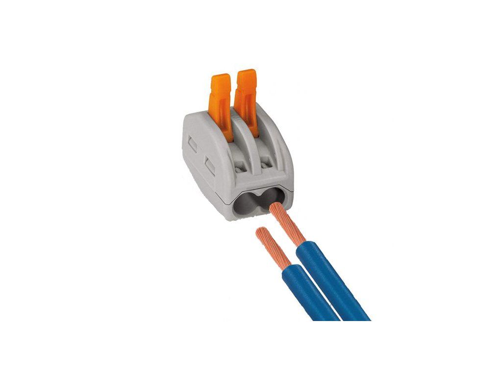 2-adrige Klemmen vom Typ WAGO mit Hebel für einfache Montage und Demontage von Kabeln.