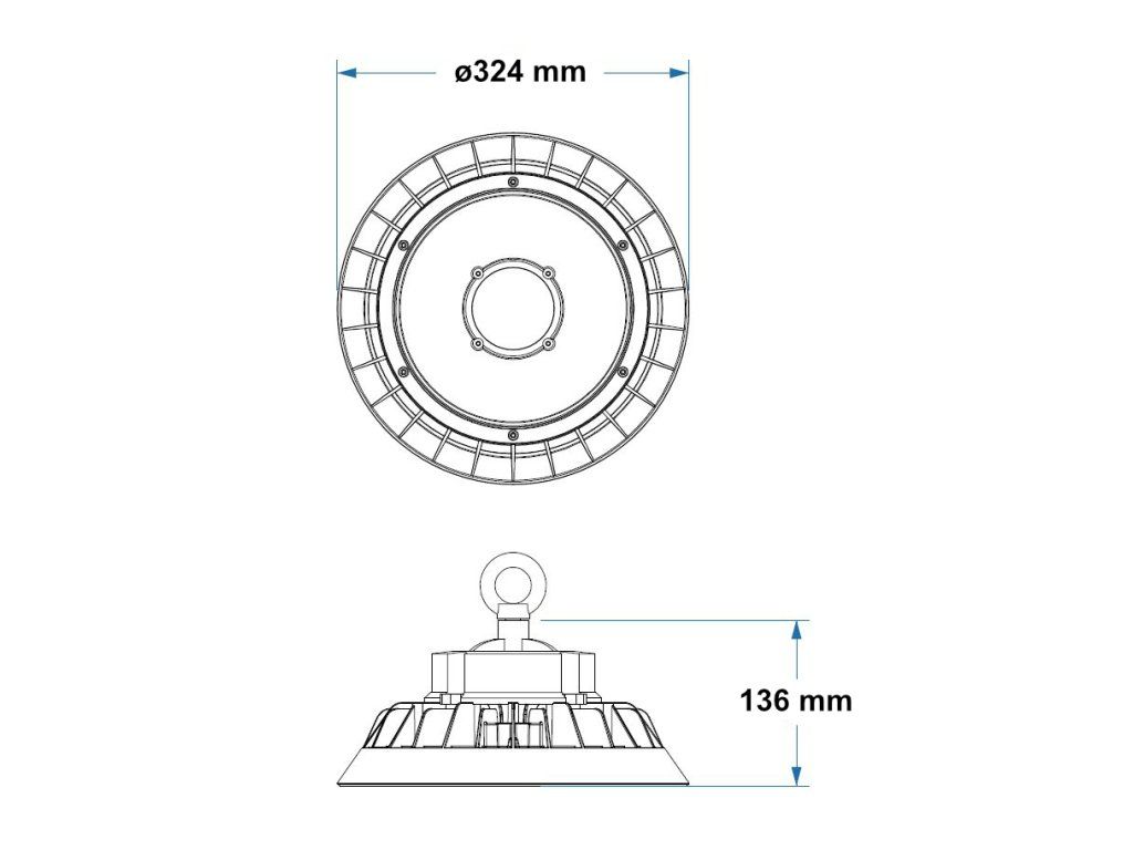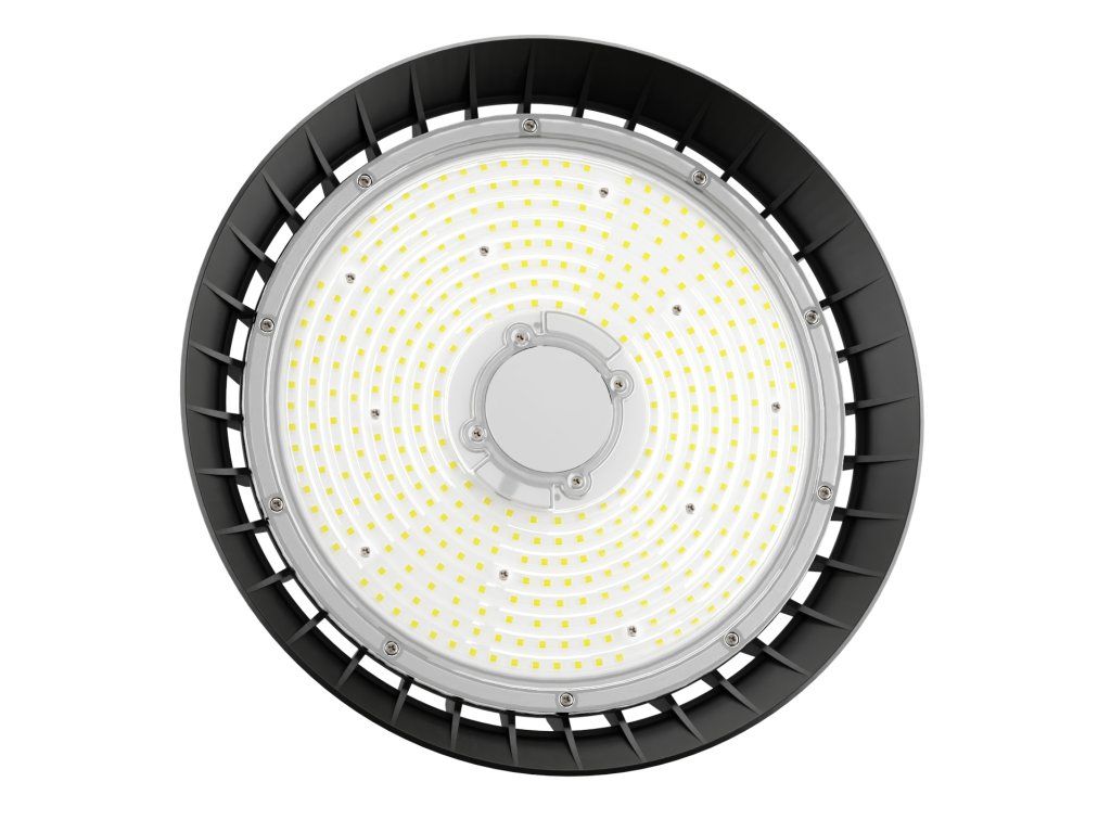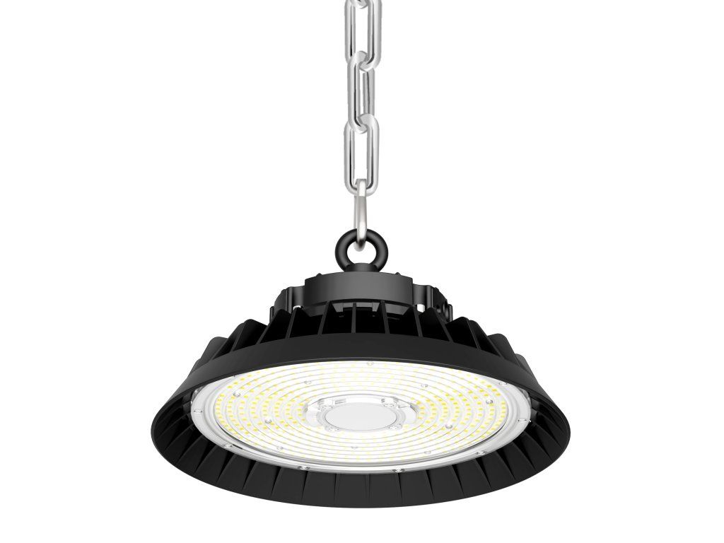 Die hängende LED-Leuchte vom Typ UFO High-bay eignet sich für Räume mit hoher Decke. Dank IP-Schutzart IP65 ist es resistent gegen Feuchtigkeit und das Eindringen von Fremdkörpern. Diese Leuchte erreicht eine Lichtausbeute von bis zu 150lm/W, was sie zu einer leistungsstarken Industrieleuchte macht. Das Gehäuse besteht aus Aluminiumdruckguss, was eine perfekte Kühlung der Lampe gewährleistet.
