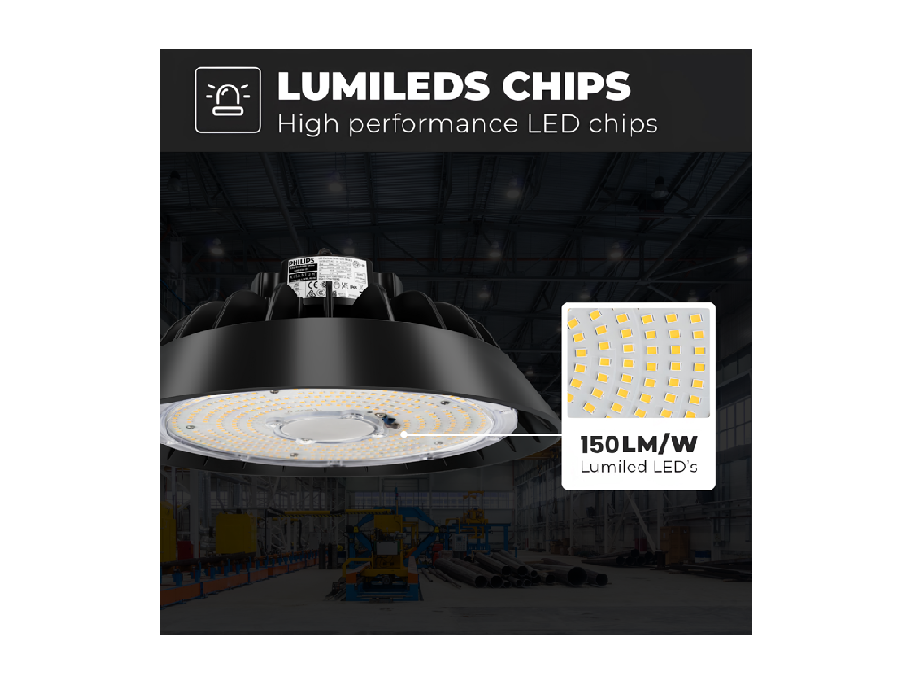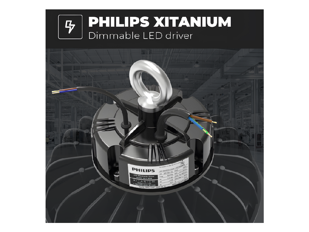 Dieser industrielle UFO High-bay ist mit hochwertigen Komponenten von Philips ausgestattet. Dank dieser hochwertigen Komponenten bieten wir eine verlängerte Garantie von 5 Jahren. Dank seiner IK08-Beständigkeit ist er zudem sehr widerstandsfähig gegen Beschädigungen.