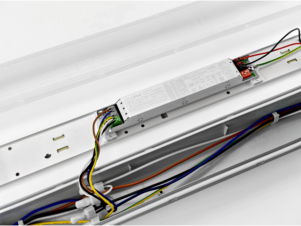 Mit dem integrierten DIP-Schalter können Sie ganz einfach die benötigte Leuchtenleistung im Bereich von 26 W, 34 W, 42 W oder 50 Weinstellen, wodurch Sie die Lichtintensität präzise an eine bestimmte Anwendung anpassen können, ohne die Leuchte austauschen zu müssen. Im Inneren ist ein hochwertiger LED-Netzteil der Marke Lifud mit Dimmfunktion über den DALIBus verbaut, wodurch die Leuchte vollständig mit professionellen Lichtsteuerungssystemen kompatibel ist. Zur Steuerung kann ein Triac DALI Dimmer aus unserem Angebot verwendet werden.