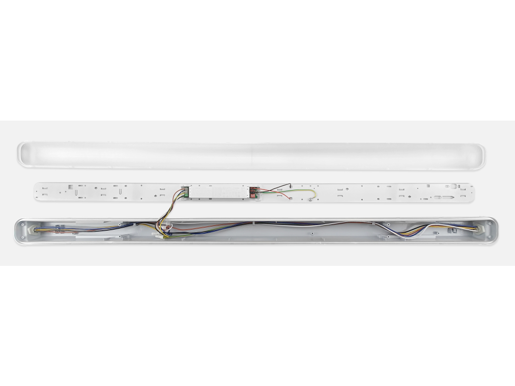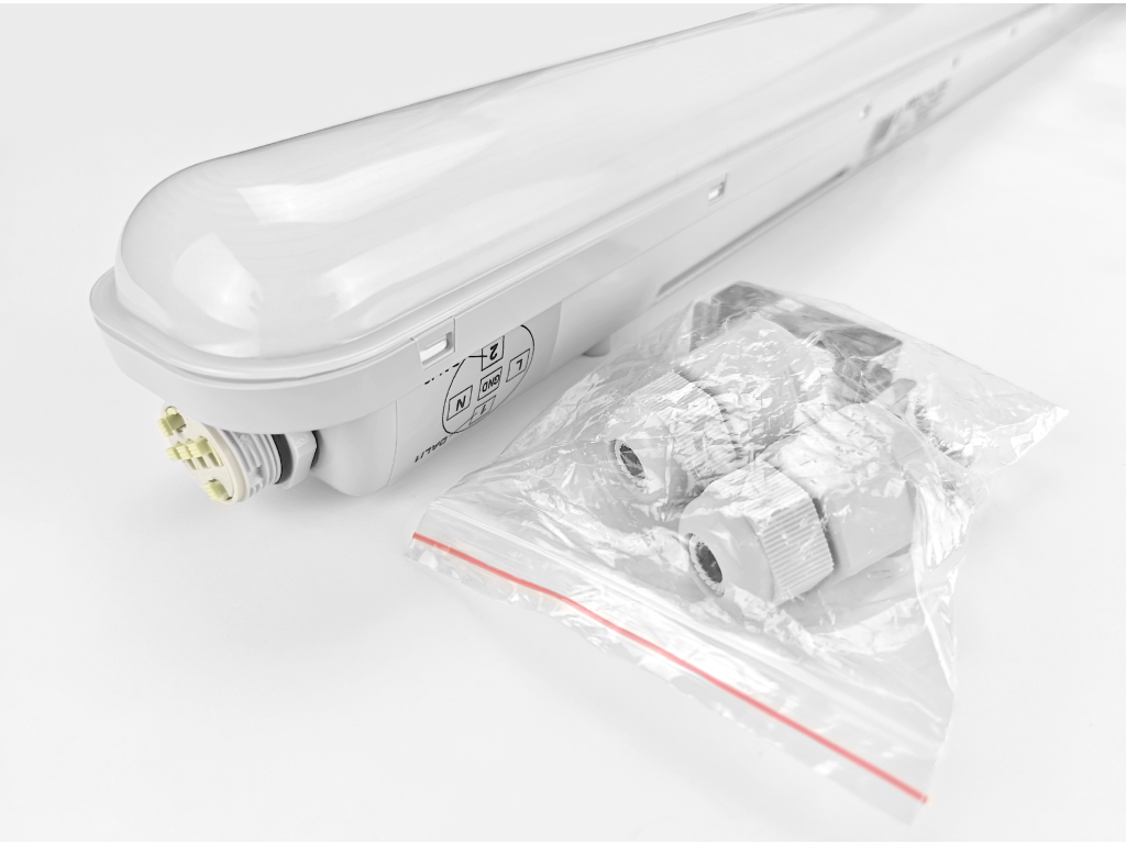 Die Montage ist auf Geschwindigkeit und Einfachheit ausgelegt. Die Leuchte ist an beiden Enden mit Steckverbindern ausgestattet, die eine einfache Verdrahtung und Durchgangsverkabelung ermöglichen. Befestigungselemente und Kappen zur Aufrechterhaltung der IP-Schutzart bei ungenutztem Eingang sind ebenfalls im Lieferumfang enthalten. Dank der Schutzklasse I ist die Leuchte für den festen Anschluss an die Elektroinstallation bestimmt.