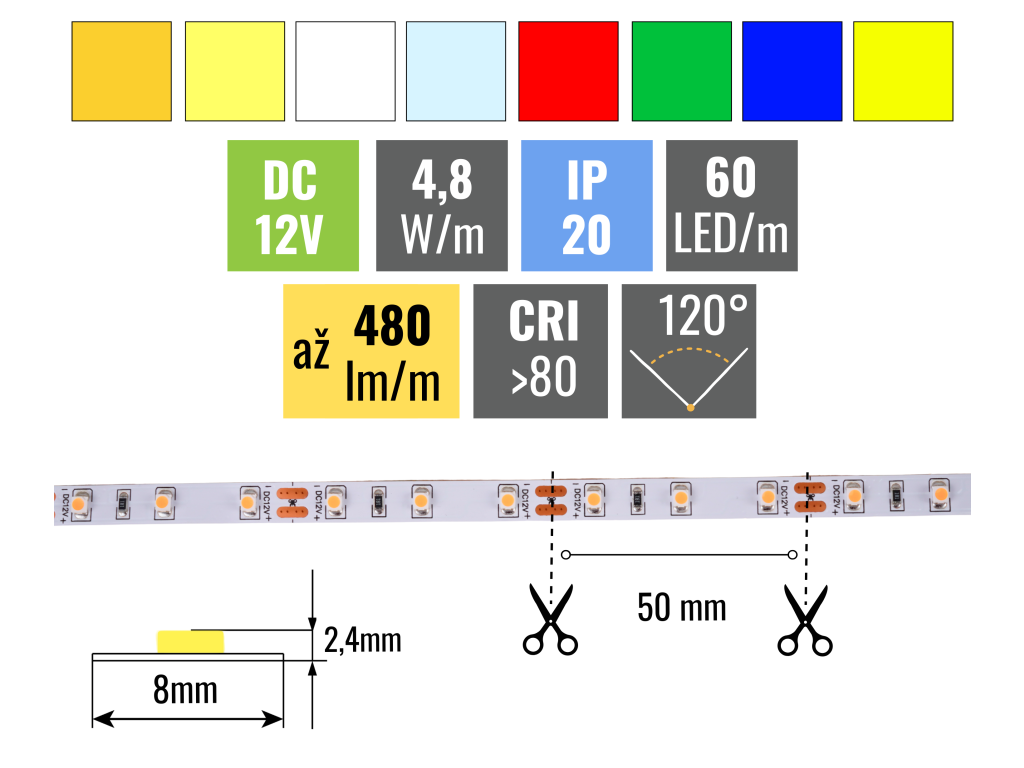Aus einer Leistung von 4,8W/m erzeugt der Streifen bis zu 480lm/m. Die Dichte der LEDs beträgt 60 Stück/m, wodurch der Streifen über seine gesamte Länge gleichmäßig leuchtet. Dieser Streifen muss nicht in eine Aluminiumleiste geklebt werden, dennoch empfehlen wir, diesen Schritt in Betracht zu ziehen. Alle unsere Streifen sind mit 3M 300LSE Klebefolie ausgestattet, die hervorragend auf dem Untergrund haftet. Dieser muss glatt sein und vor dem Kleben gründlich entfettet werden.