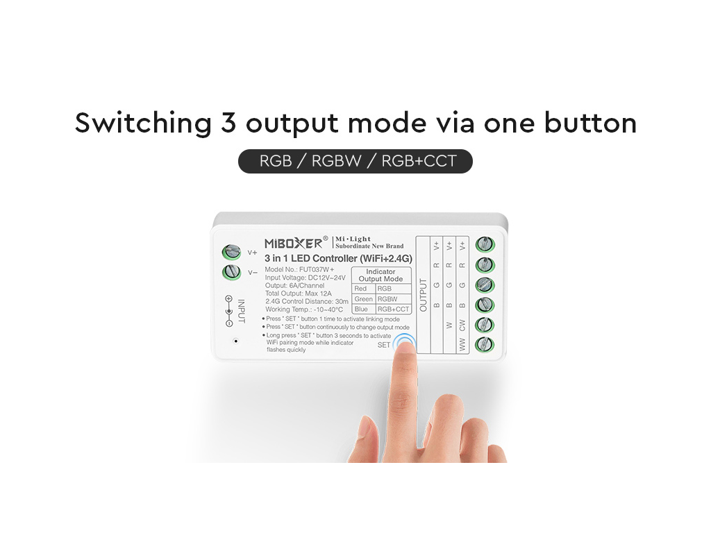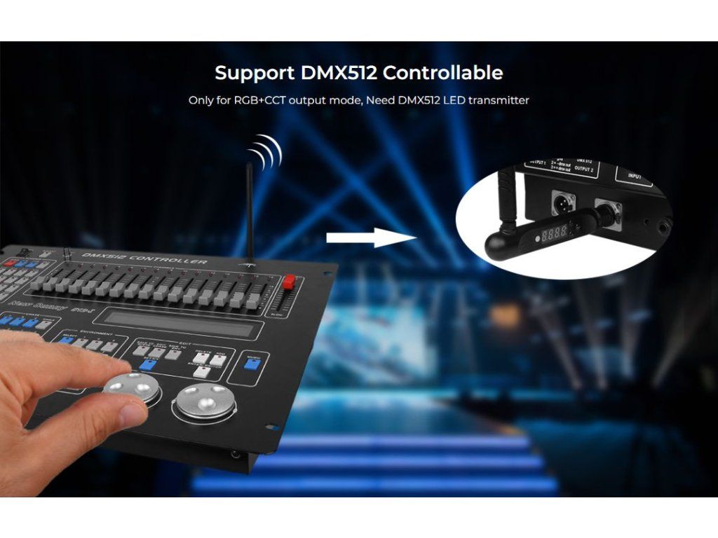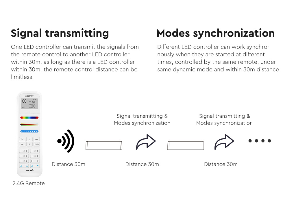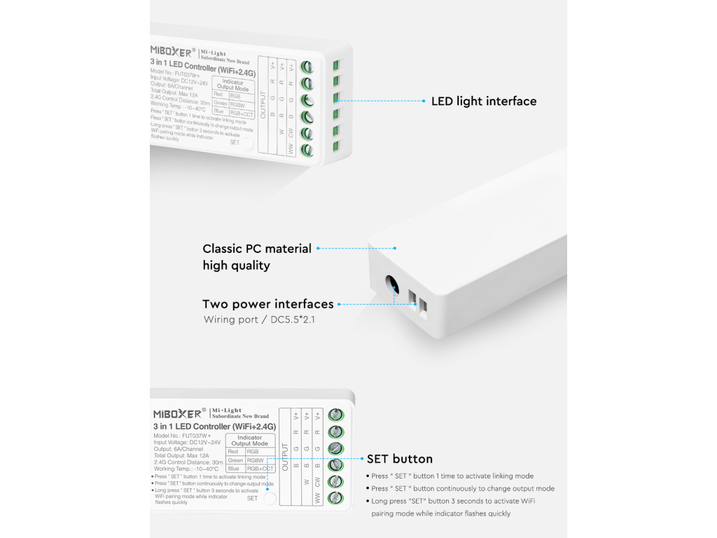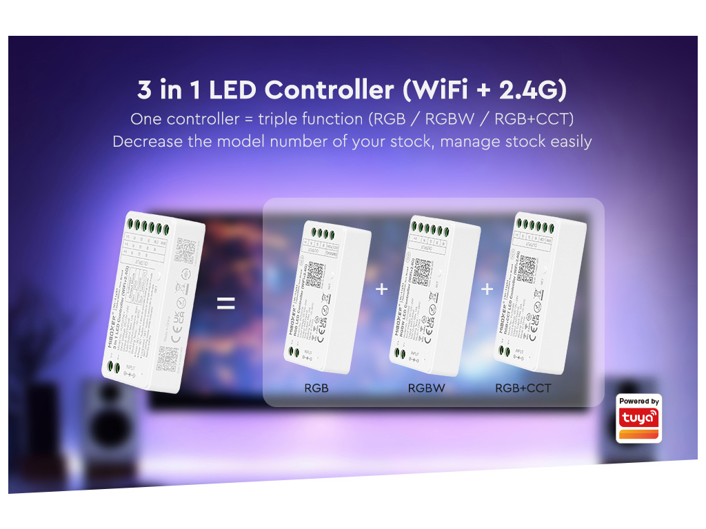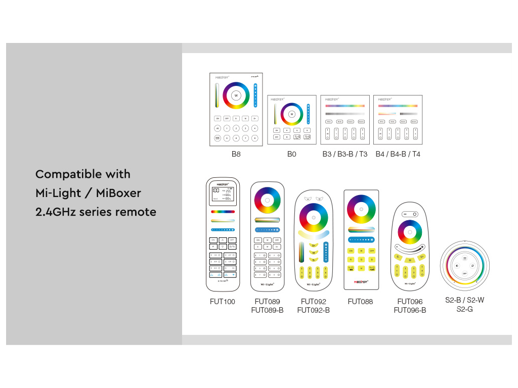 Empfänger und Dimmer für LED-Produkte der Serie Mi-Light / MiBoxer, der über das WLAN-Signal auf dem TUYA-Protokoll kommuniziert. Der Empfänger kann versteckt werden (hinter einer Wand, Gipskarton oder in einem Schrank), eine direkte Sichtverbindung zwischen Empfänger und Fernbedienung ist nicht erforderlich.