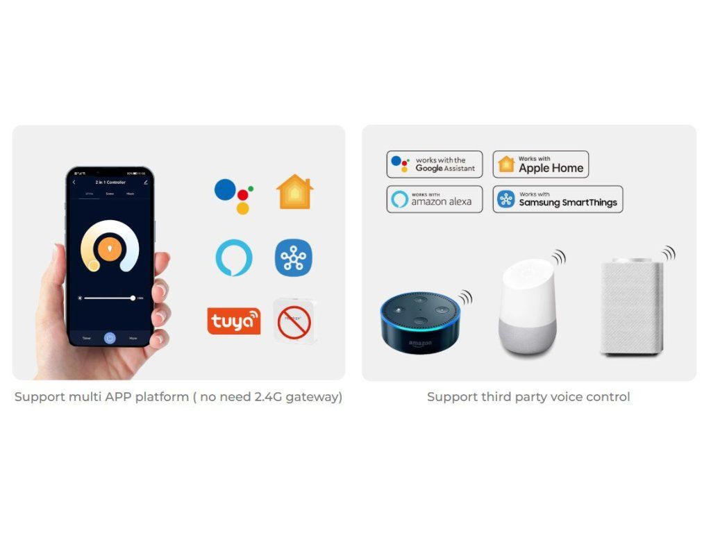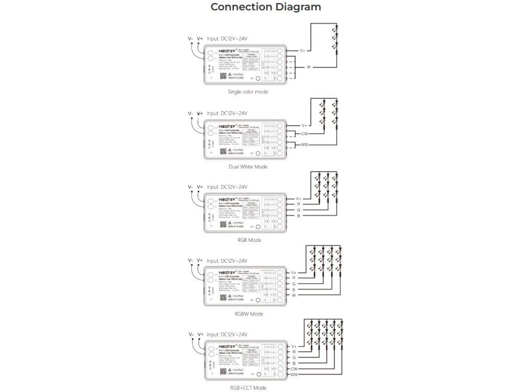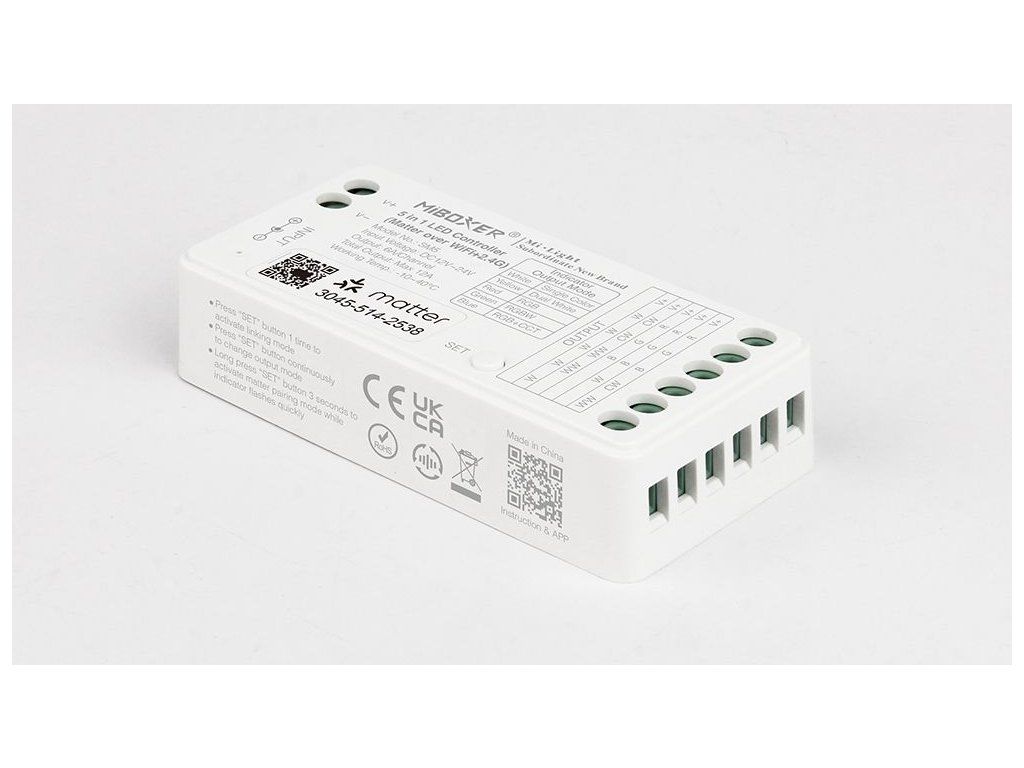 Die Kommunikation erfolgt über das Matter-Protokoll auf WLAN-Frequenz in Kombination mit RF-Signal. Der Empfänger benötigt kein separates Mi-Light / MiBoxer Gateway, für die Integration in ein Smart Home ist jedoch eine kompatible Matter-Steuereinheit erforderlich (z.B. Google Home, Apple Home, Amazon Echo oder ein anderer Matter Hub). Dadurch lässt sich der Empfänger einfach in moderne Smart-Home-Ökosysteme integrieren und innerhalb von Szenen, Automatisierungen und Sprachbefehlen steuern.