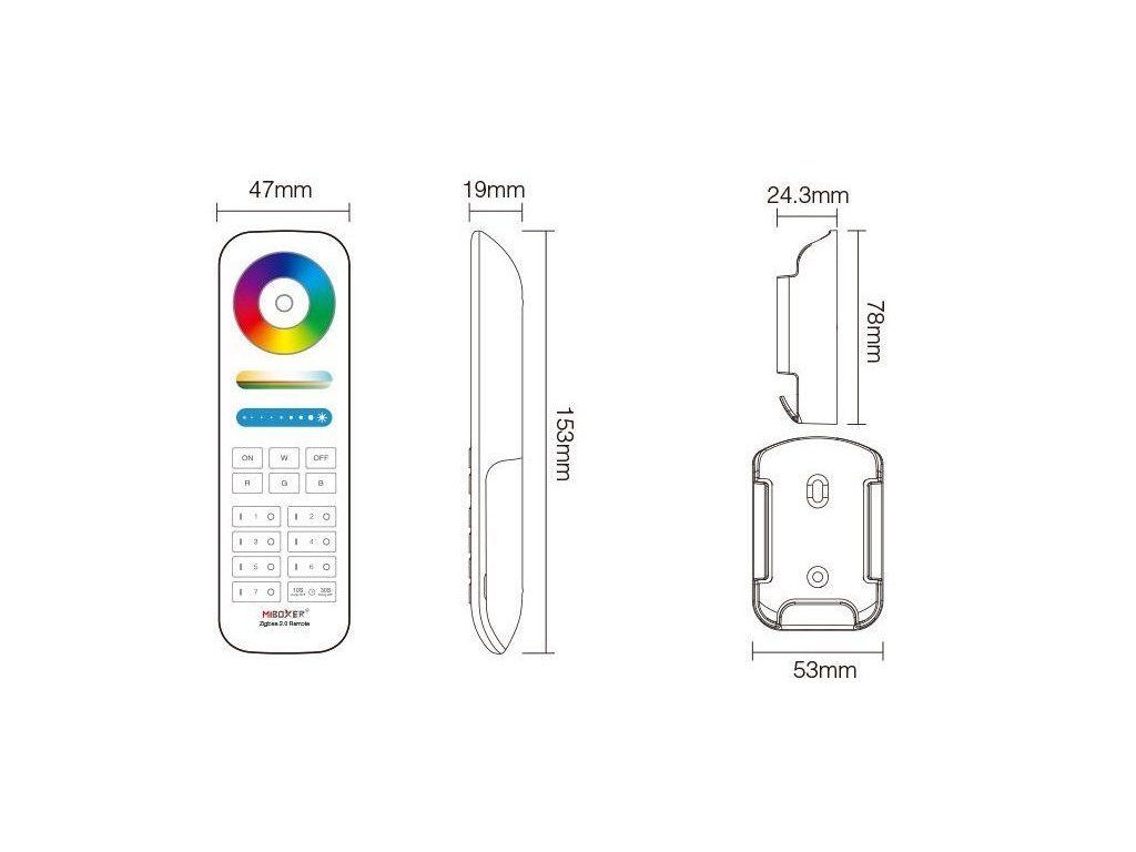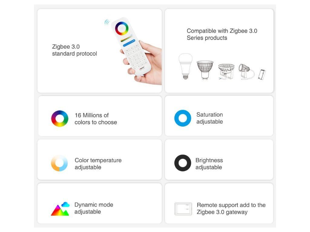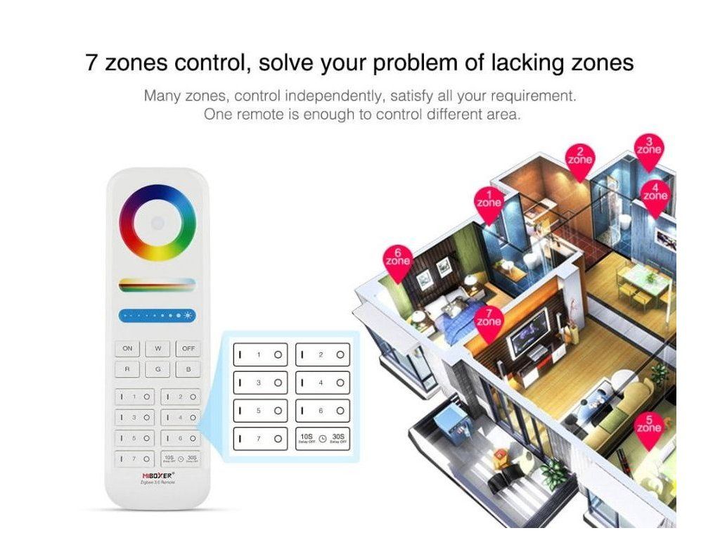 Mi-Light Fernbedienung zur Steuerung von RGB+CCT-Produkten der Mi-Light / MiBoxer Serie, die auf dem ZigBee 3.0 Protokoll arbeiten. Mit einer Fernbedienung können Sie bis zu 7 Beleuchtungszonensteuern, die aus mehreren Empfängern bestehen können. Diese Empfänger werden nach dem Abgleich mit der Fernbedienung als eine Sektion gesteuert.