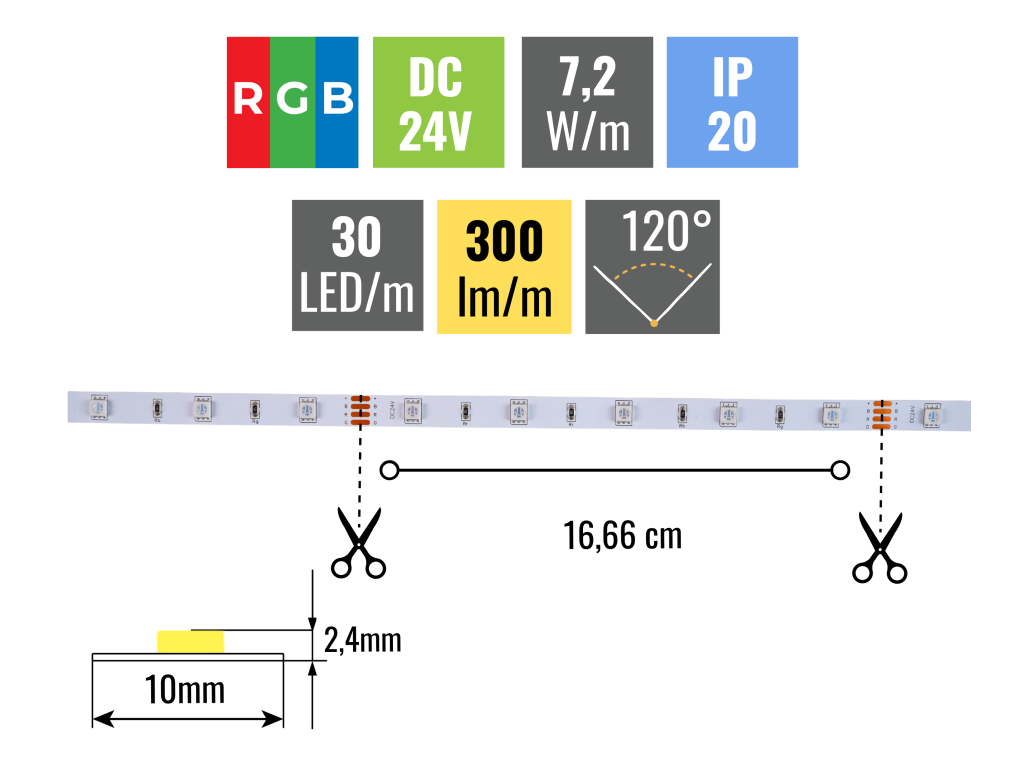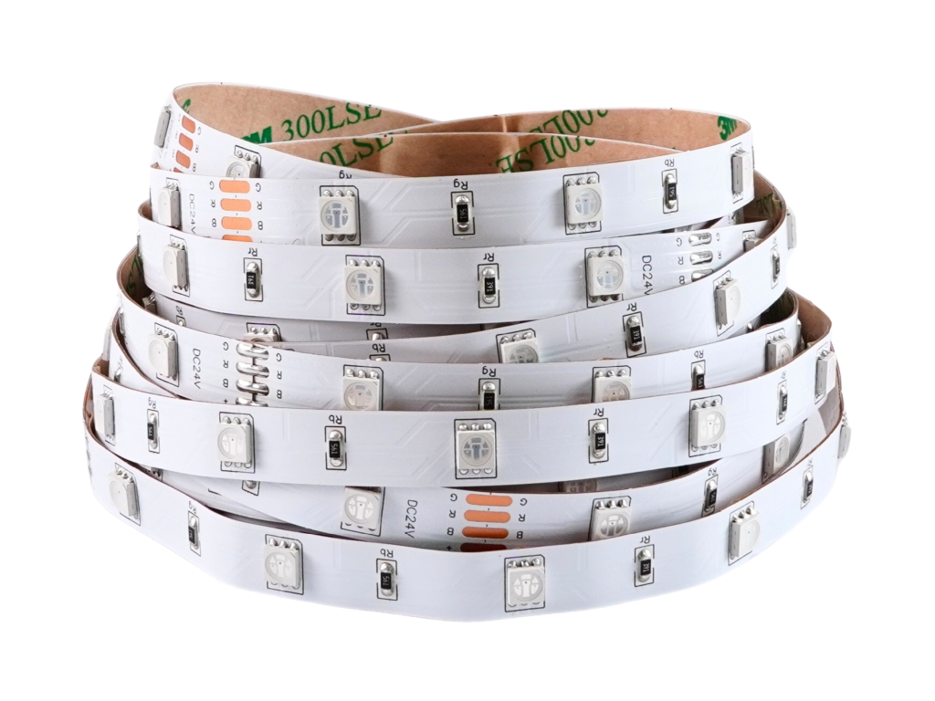 Aus einer Leistung von 7,2W/m produziert der RGB-Streifen bis zu 300lm/m. Die Dichte der LEDs beträgt 30 Stück/m, wodurch der Streifen über seine gesamte Länge gleichmäßig leuchtet. Dieser Streifen muss nicht in eine Aluminiumleiste geklebt werden, dennoch empfehlen wir, diesen Schritt in Betracht zu ziehen. Alle unsere Streifen sind mit 3M 300LSE Klebefolie ausgestattet, die hervorragend auf dem Untergrund haftet. Dieser muss glatt sein und vor dem Kleben gründlich entfettet werden.