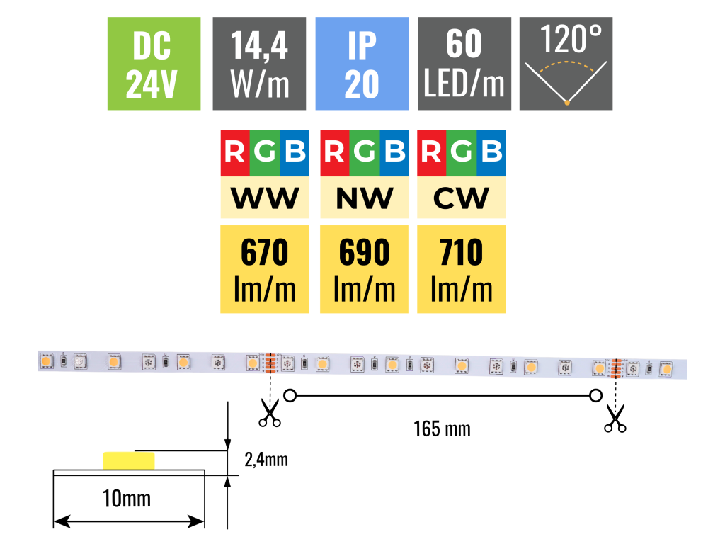 Der LED-Streifen hat eine Gesamtleistung von 14,4W/m, aufgeteilt in 7,2W/m für RGB-Dioden und 7,2W/m für einfarbige Dioden.