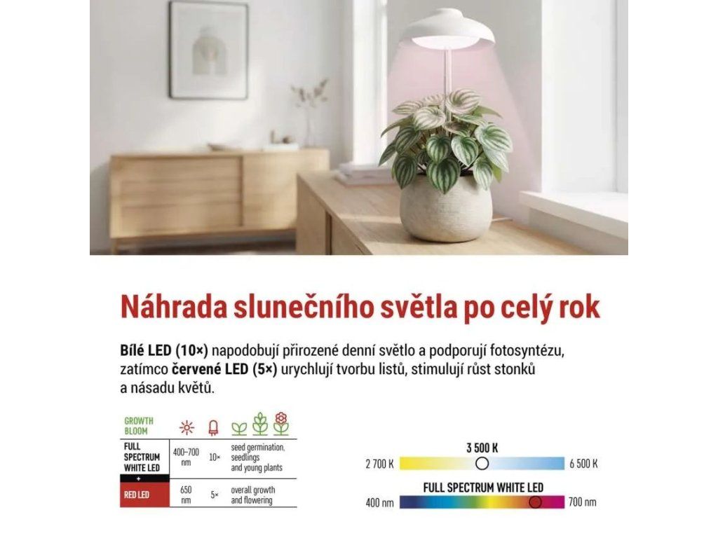 Die Leuchte nutzt Vollspektrum-LED-Technologie im Bereich von 400–700 nm, die das Sonnenlicht getreu nachbildet. Die Kombination aus weißen und roten LEDs unterstützt die Photosynthese, das natürliche Wachstum von Blättern und Stängeln sowie die Ausbildung eines starken Wurzelsystems und trägt gleichzeitig zu einer üppigeren Blüte bei. Weiße LEDs sorgen für natürliches Tageslicht und ein gesundes Aussehen der Pflanzen, während das rote Lichtspektrum Wachstum und Regeneration anregt.