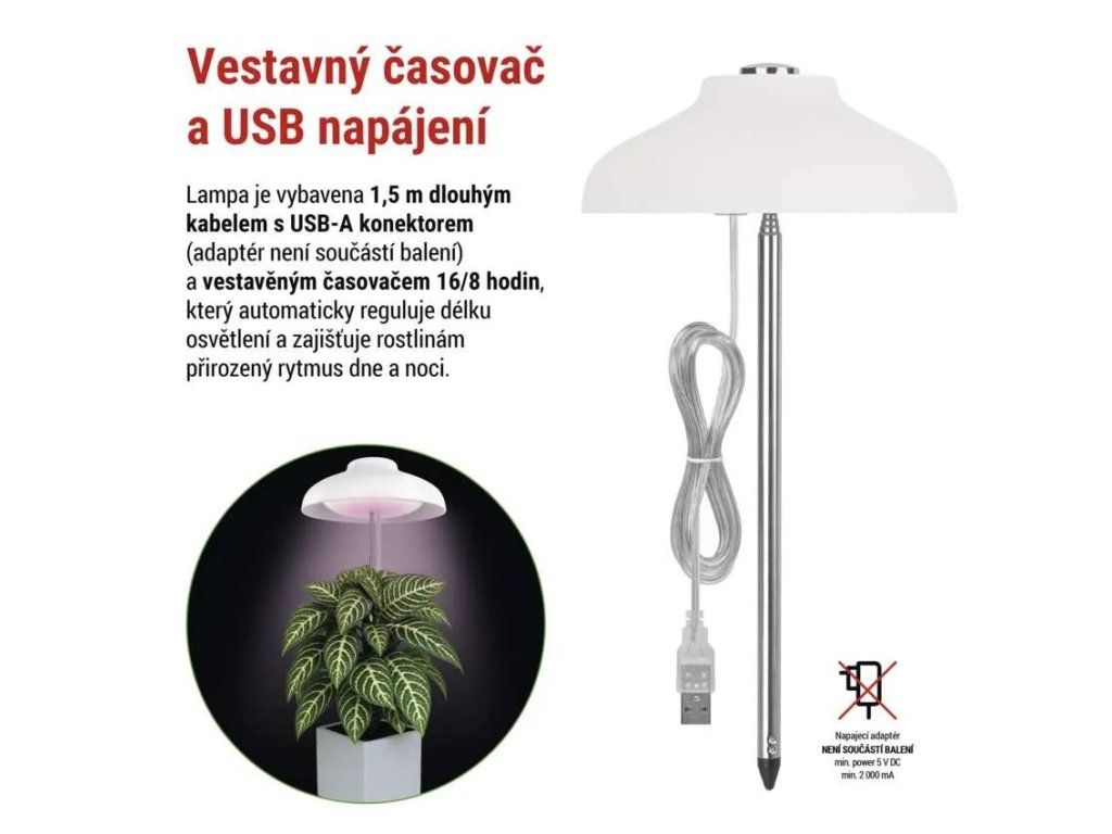 Die Lampe wird über einen USB-A-Anschluss und ein 1,5 m langes Kabelmit Strom versorgt, das den Anschluss an einen USB-Adapter, eine Powerbank oder einen Computer ermöglicht. Der eingebaute Timer mit einem 16/8-Stunden-Modus wechselt automatisch zwischen Licht- und Dunkelphasen und hilft den Pflanzen so, einen natürlichen Tagesrhythmus beizubehalten, ohne dass eine manuelle Steuerung erforderlich ist.