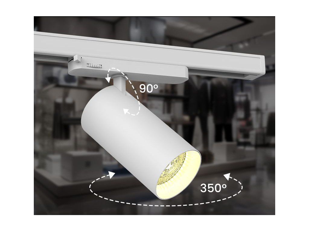 Der Strahler ist mit einem hochwertigen integrierten Netzteil ausgestattet, das fast vollständig in der Stromschiene verborgen ist. Dank des Abstrahlwinkels von 36° ist er ideal für die Beleuchtung von Einkaufszentren, Geschäften, Showrooms, Galerien und Museen. Der Schienenstrahler ist mit einer doppelten Drehachse ausgestattet, die seine Bewegung im horizontalen Bereich bis zu 350° und im vertikalen Bereich bis zu 80° ermöglicht. Dank dieser Flexibilität kann der Strahler je nach aktuellem Bedarf und Umgebung beliebig ausgerichtet werden.