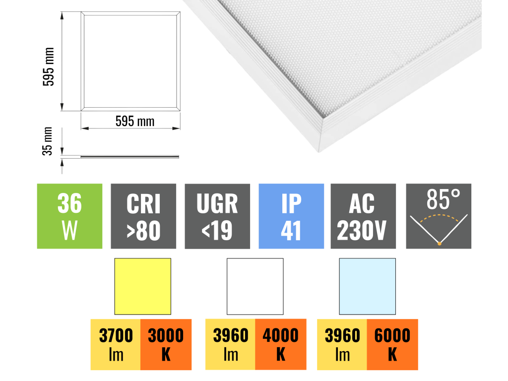 LED-Panel mit prismatischem Diffusor zur Reduzierung von Blendung zu einem attraktiven Preis. Dank des Parameters UGR <19 (blendfrei) eignet es sich besonders für Büros und andere Arbeitsplätze, an denen besonderer Wert auf angenehmen Lichteinfall gelegt wird.Dieses Panel mit einer Leistung von 36 W und Abmessungen von 60 x 60 cm ist ideal für abgehängte Anwendungen. Es wird am häufigsten in Kassettendecken eingesetzt, wo das Panel lediglich an das Stromnetz angeschlossen werden muss. Für die Montage der Panels ist kein zusätzliches Zubehör erforderlich.